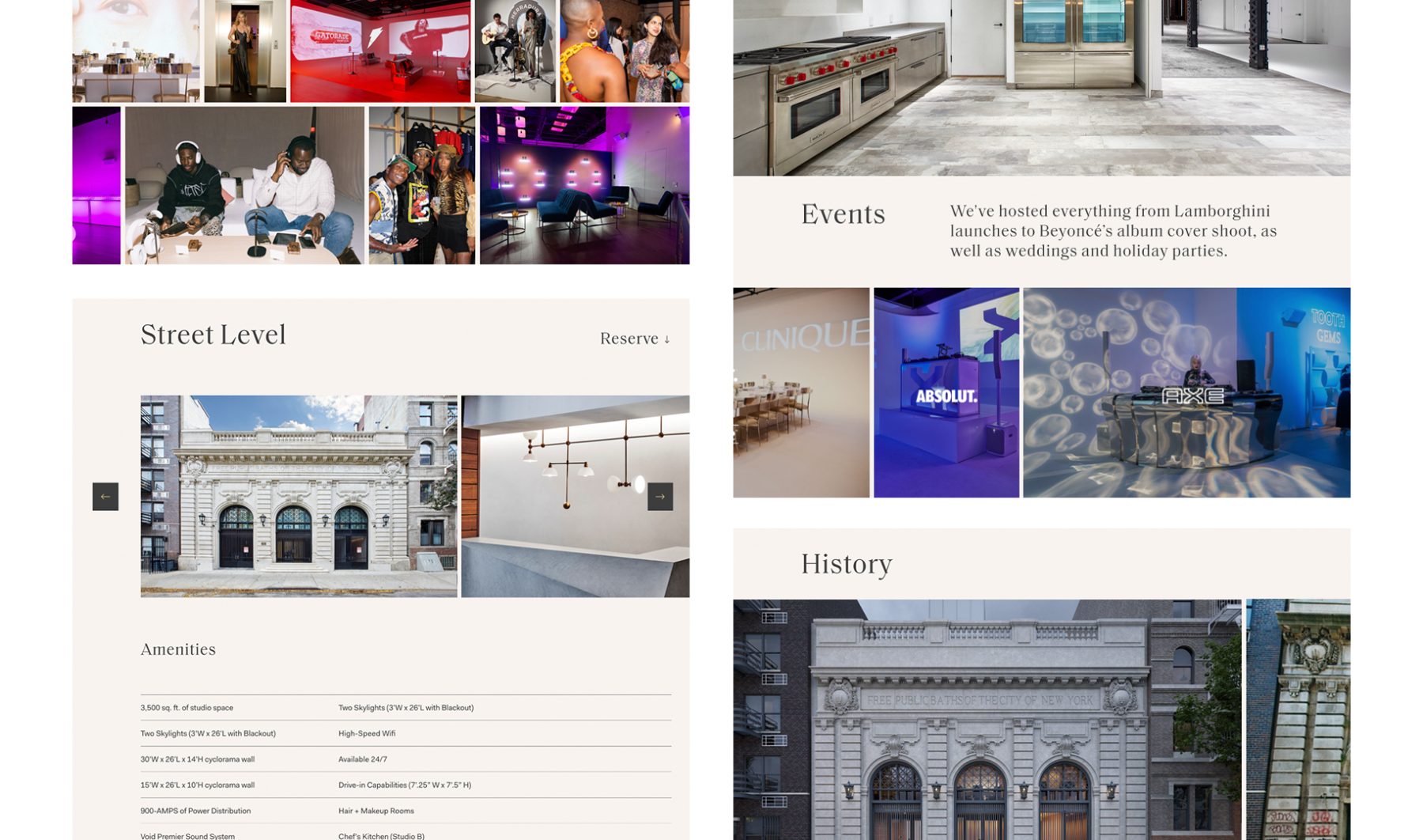 The website KUDOS designed for Bathhouse Studios includes detailed information on its event spaces, functionality for making reservations, past events hosted by the studio, the building’s history, and much more. The website’s design adds to the studio’s luxury appeal by seamlessly blending captivating visual elements like animated graphics of the front facade, a subtle parallax animation of images and text, prominent large typography, and a sleek full-screen menu.