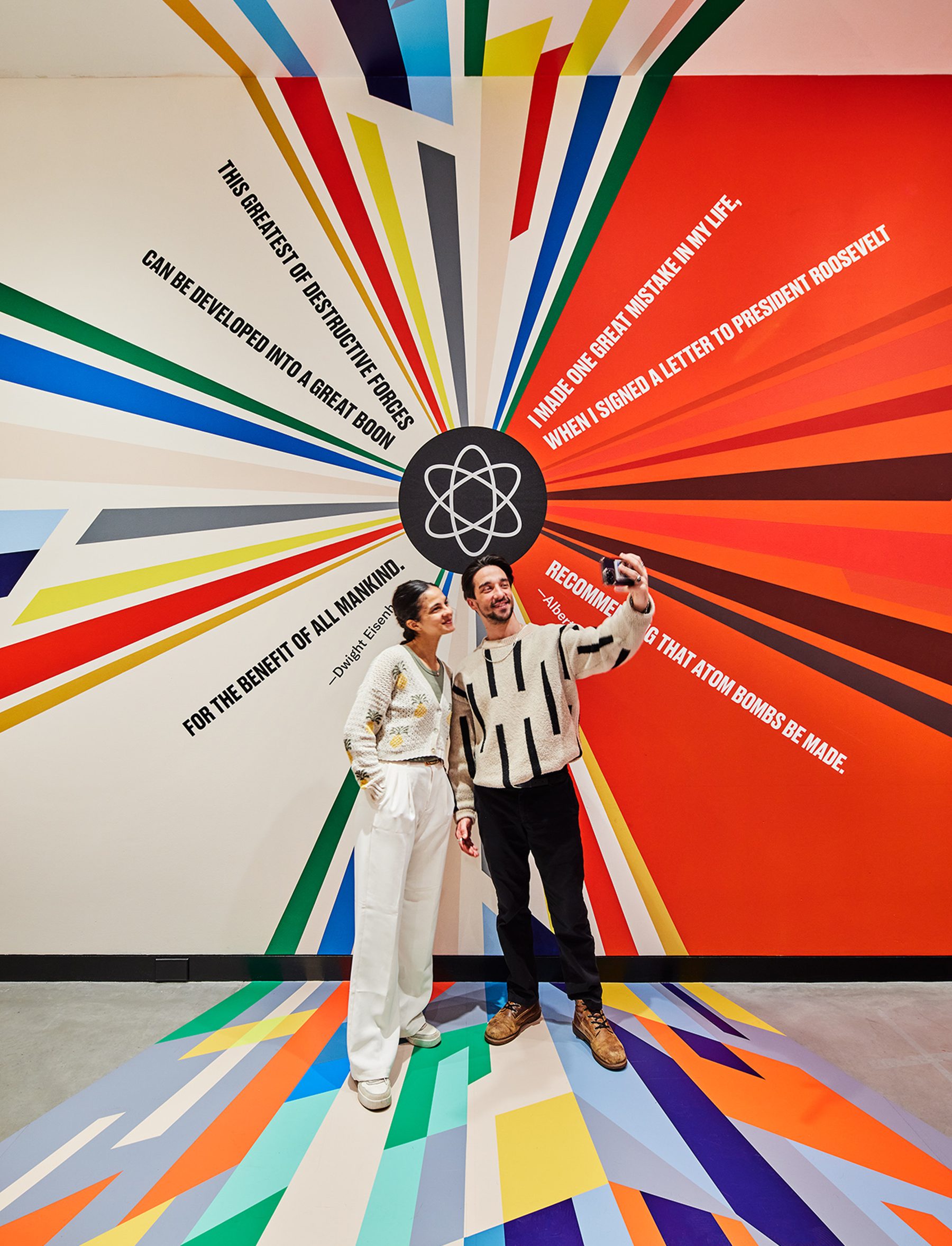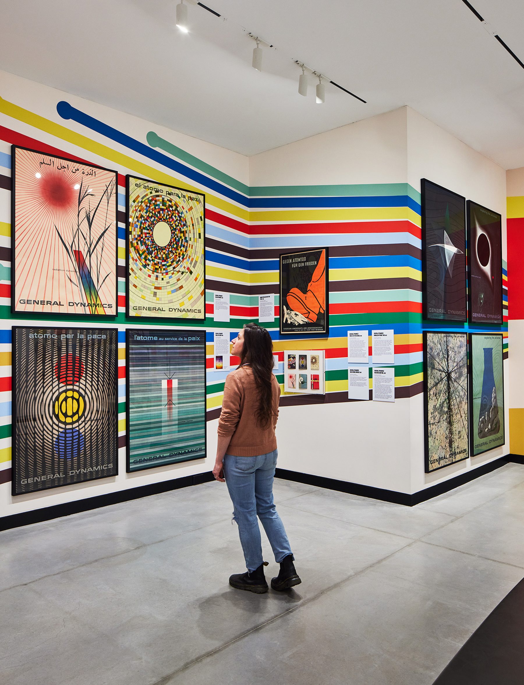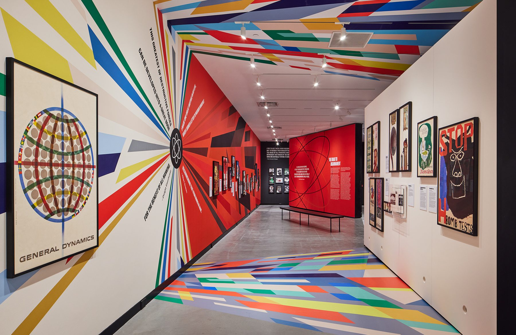 Our exhibition design extrapolated Erik Nitsche’s design for Atom for Peace poster that juxtaposed a quote from Eisenhower against Einstein’s, in the form of a colorful explosion, a schism resulting from the splitting of the atom, releasing color graphics that span distances, time, and surfaces.