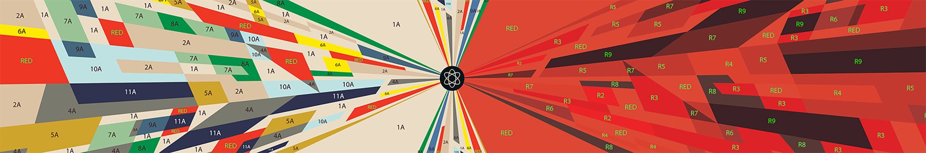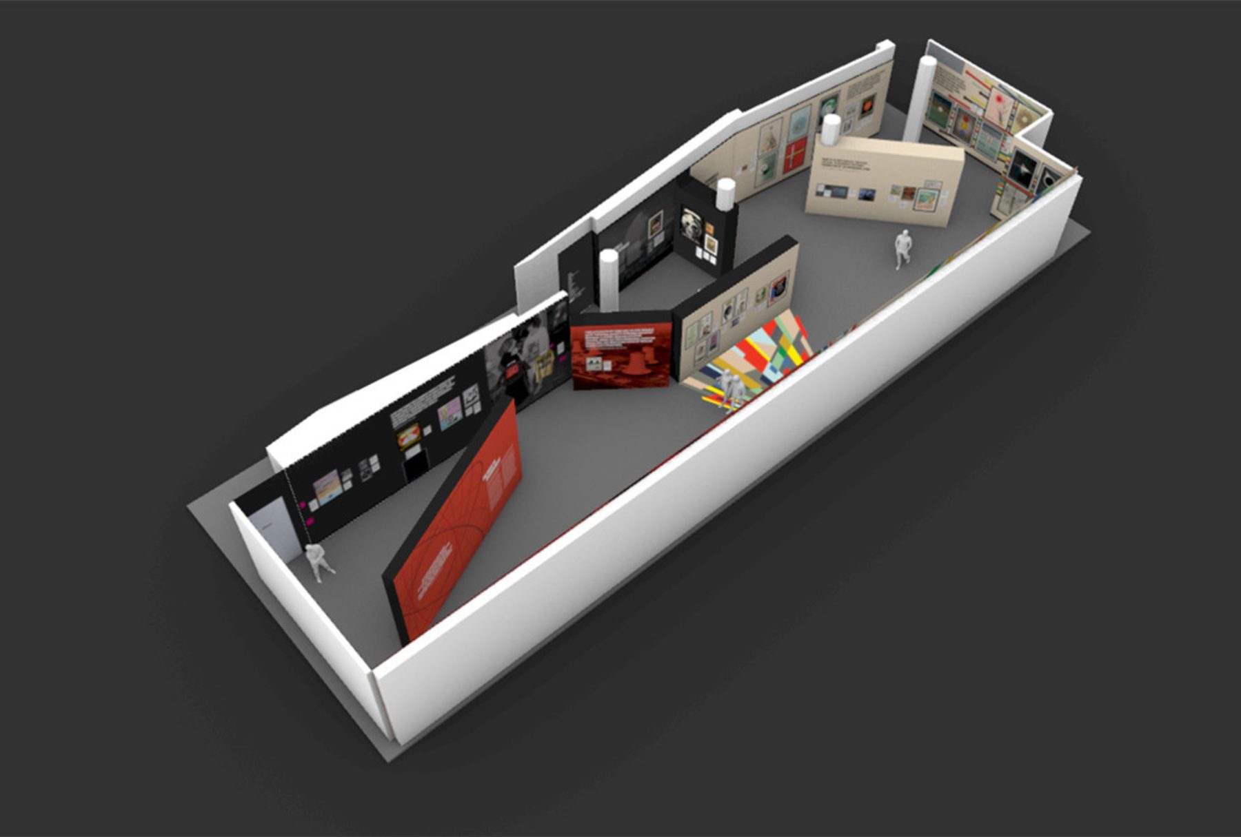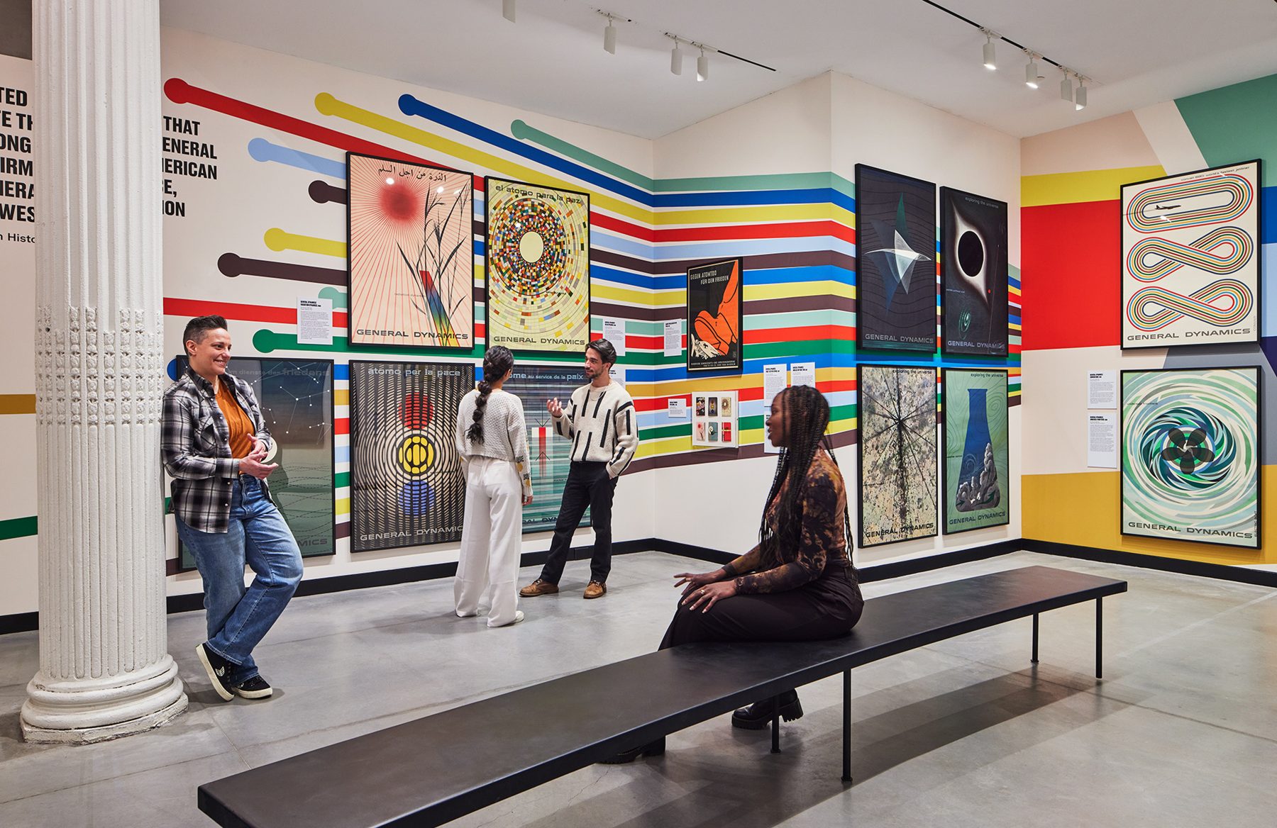 Our exhibition design extrapolated Erik Nitsche’s design for Atom for Peace poster that juxtaposed a quote from Eisenhower against Einstein’s, in the form of a colorful explosion, a schism resulting from the splitting of the atom, releasing color graphics that span distances, time, and surfaces.