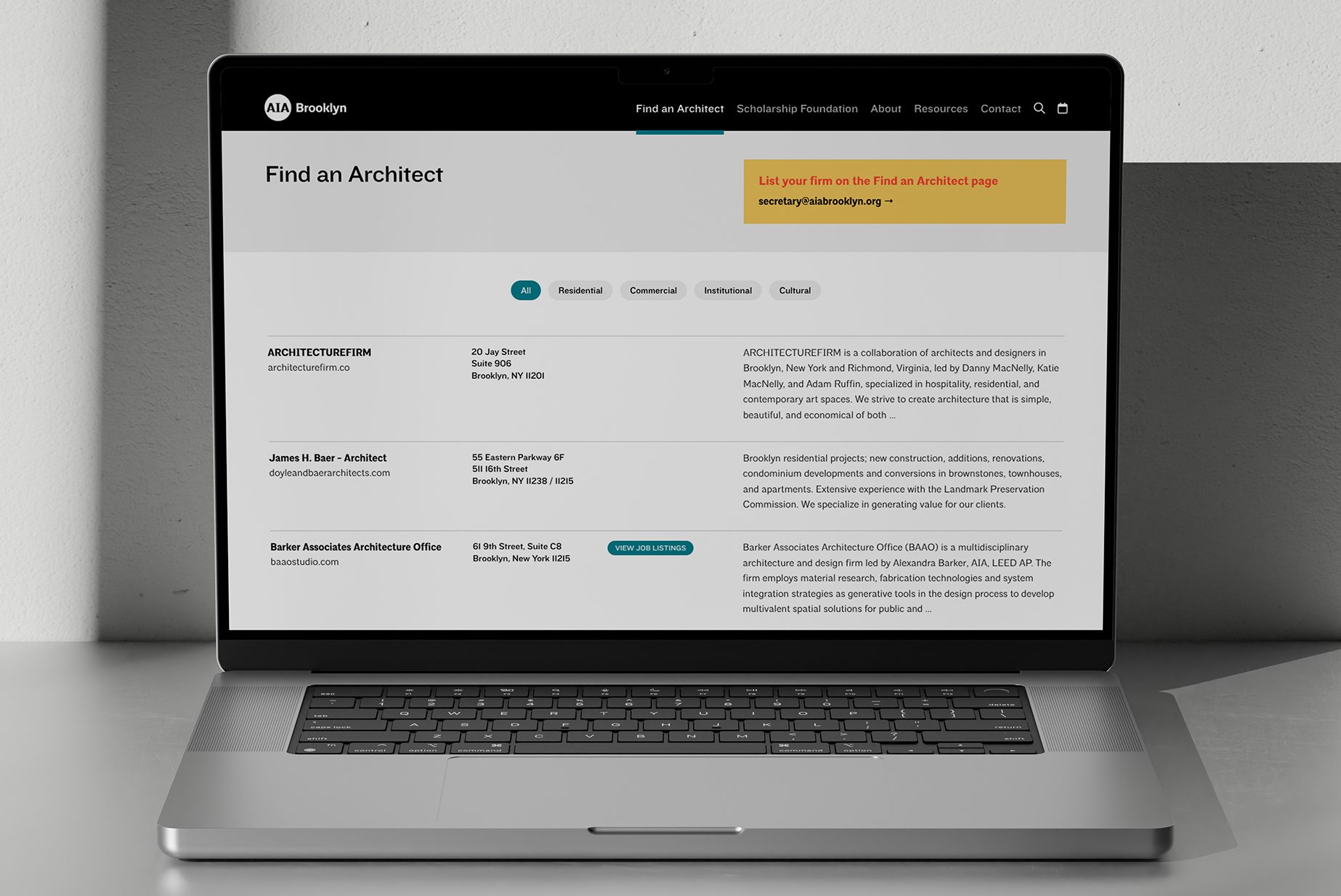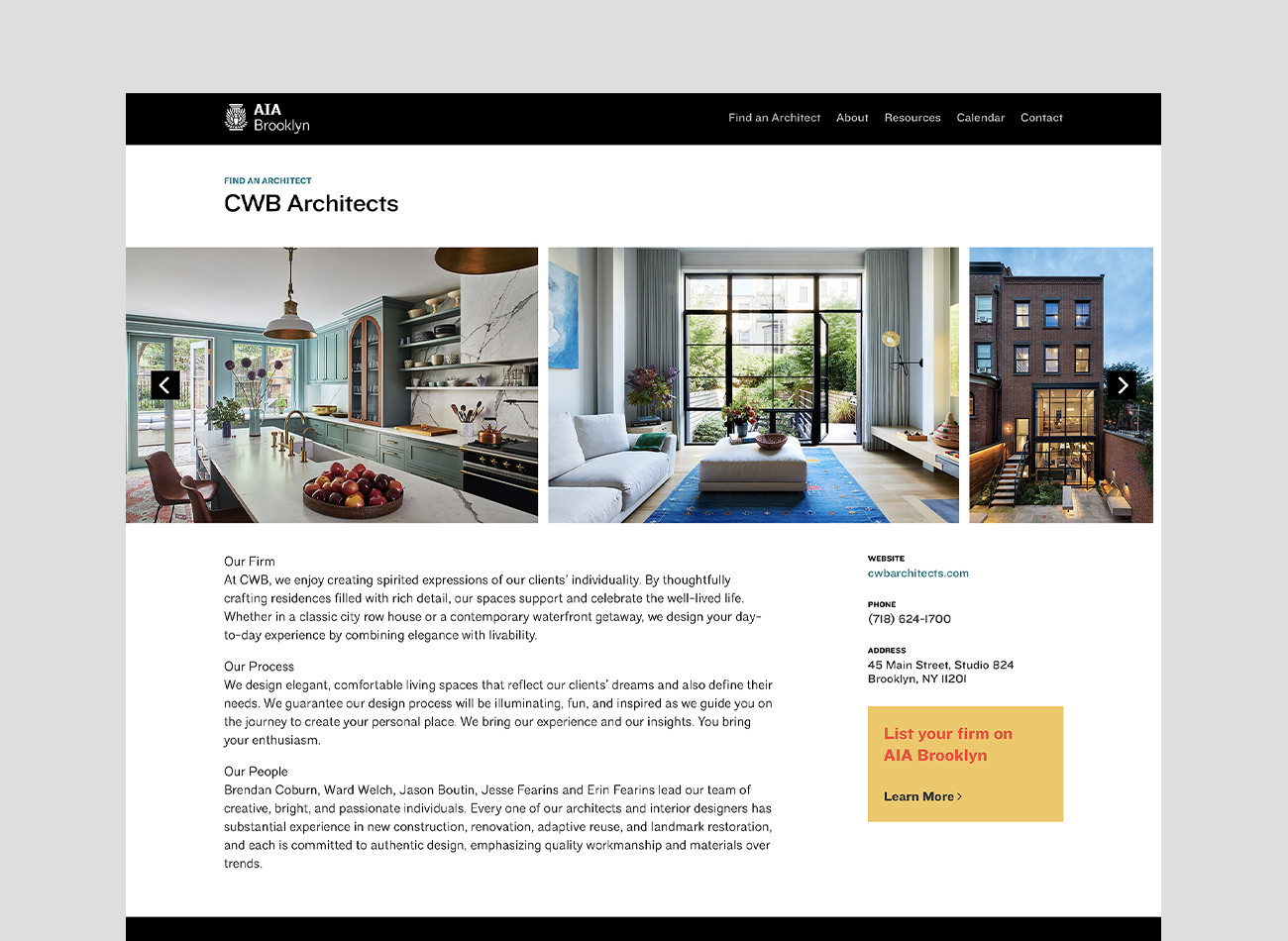The website boasts a highly functional design, incorporating key elements such as effective typographic hierarchy, color blocks for information grouping, and clear calls to action that guide users seamlessly through the site. Its standout feature is the “Find an Architect” function, which empowers users to effortlessly locate architects in the Brooklyn area from a curated list and access their contact information, fostering community engagement and enhancing opportunities for architectural services.