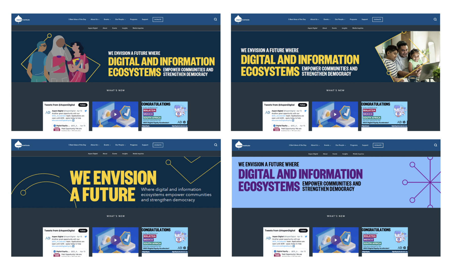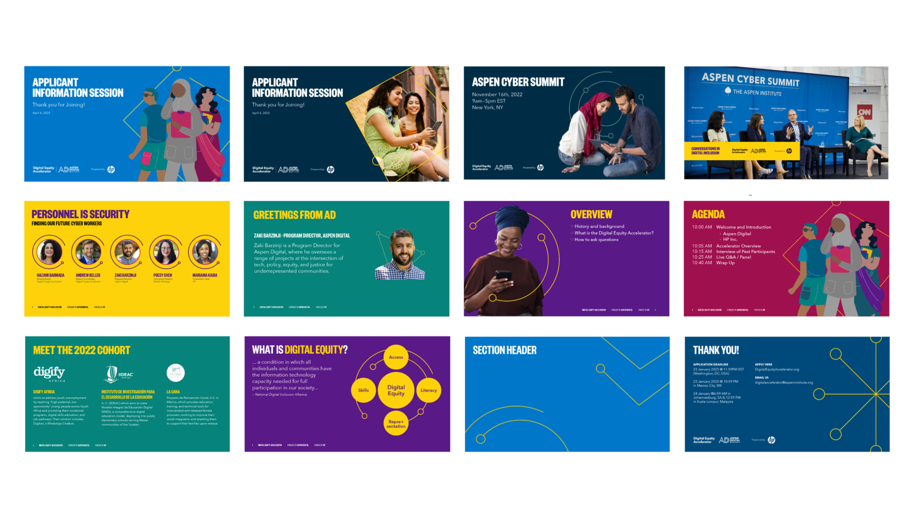 This branding project for Aspen Digital Equity reflects their commitment to fostering social innovation and digital inclusion worldwide. Collaborating with Aspen Institute’s Aspen Digital, we crafted a vibrant and inclusive visual identity, characterized by a fun, vivid palette. Custom digital templates and an illustration playbook were also developed, enabling seamless customization and reinforcing the organization’s commitment to inclusivity.