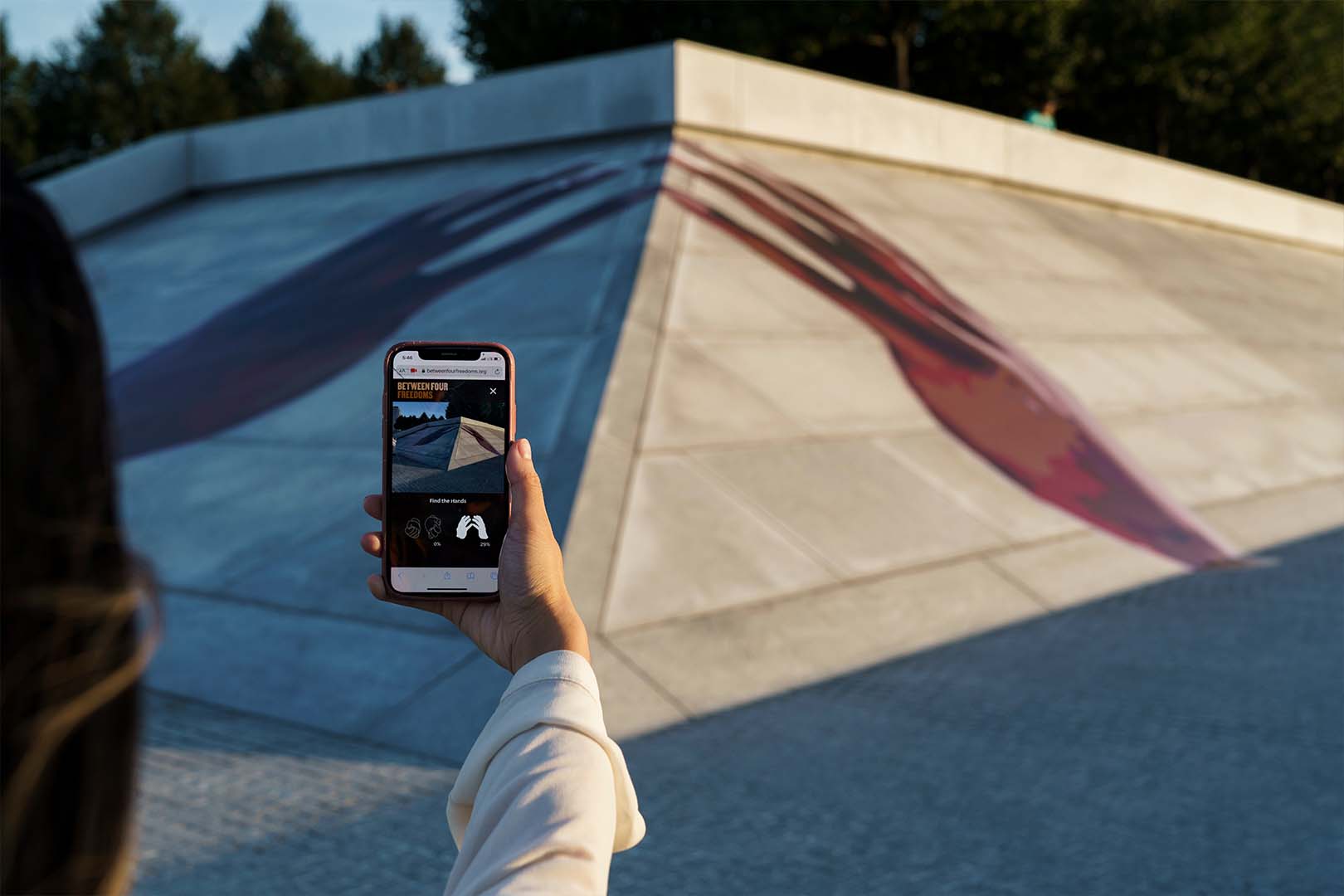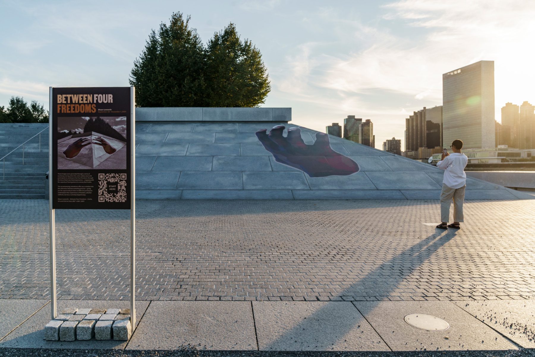 Artist Shaun Leonardo’s 2021 outdoor installation “Between Four Freedoms” reinterpreted and celebrated Franklin D. Roosevelt’s seminal 1941 address calling for freedom of worship, freedom of speech, freedom from want, and freedom from fear. The interactive experience for the installation at Franklin D. Roosevelt Four Freedoms State Park redefines public engagement with art and social discourse.
