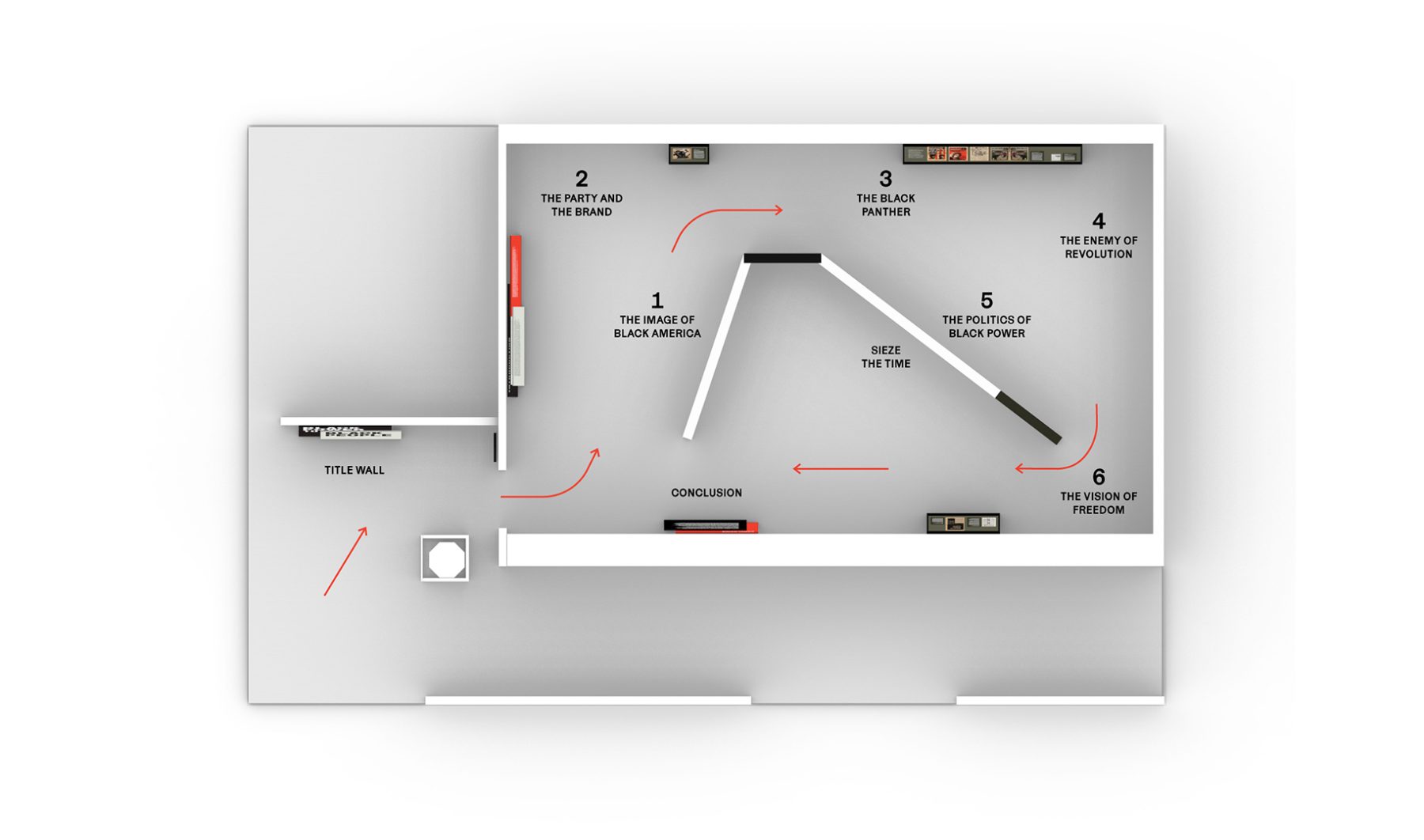 Inside, the exhibit started with an iconic photograph of Huey Newton (1967) and followed the development of Black Panther branding through six chronological sections. In the background, tracks from Seize the Time LP by Elaine Brown played on a loop, capturing the aspirations of the Black Panther Party.