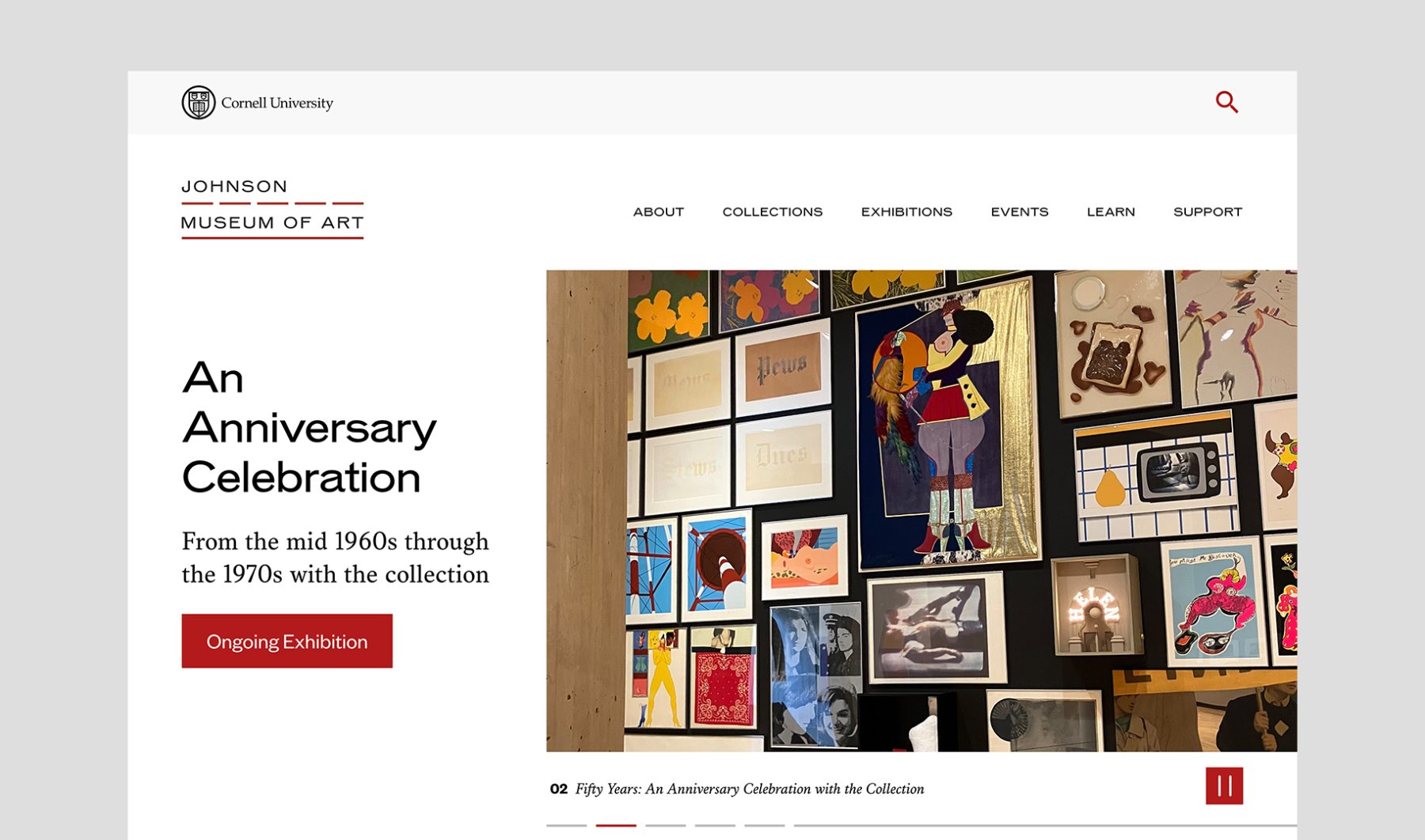 In 2022, Isometric rolled out a wide-ranging new visual identity and website design for the Johnson Museum of Art at Cornell University. Coinciding with the 50th anniversary of the museum, the new design celebrates its architecture by I.M. Pei, abstracting its iconic ribbon window into a simple, dashed line motif to signify the view from the museum onto the picturesque landscape of Ithaca and its role in interpreting the world beyond. KUDOS was tasked with developing the website, created in close collaboration with the museum and Isometric’s design team.