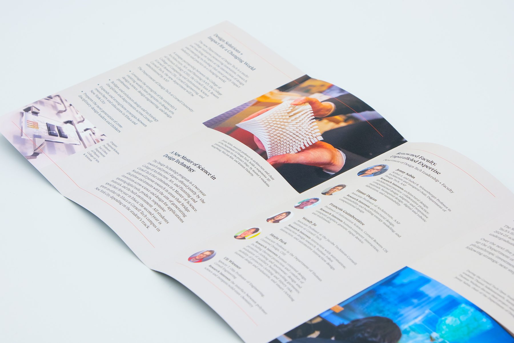 The five-panel pamphlet we designed for the Department of Design Tech serves as a captivating gateway into the innovative world of design and emerging technology. With a bold “Des Tec” letterform adorning the front cover, the brochure invites viewers to explore further, unveiling the full “design tech” message as they delve deeper into its contents. Curated images, serving as full-blown backgrounds, seamlessly merge with the technological narrative, showcasing the department’s commitment to innovation, research, and education. Integrated red lines weave subtly throughout the pamphlet, harmonizing the college’s existing branding with the pamphlet’s fresh and contemporary aesthetic.