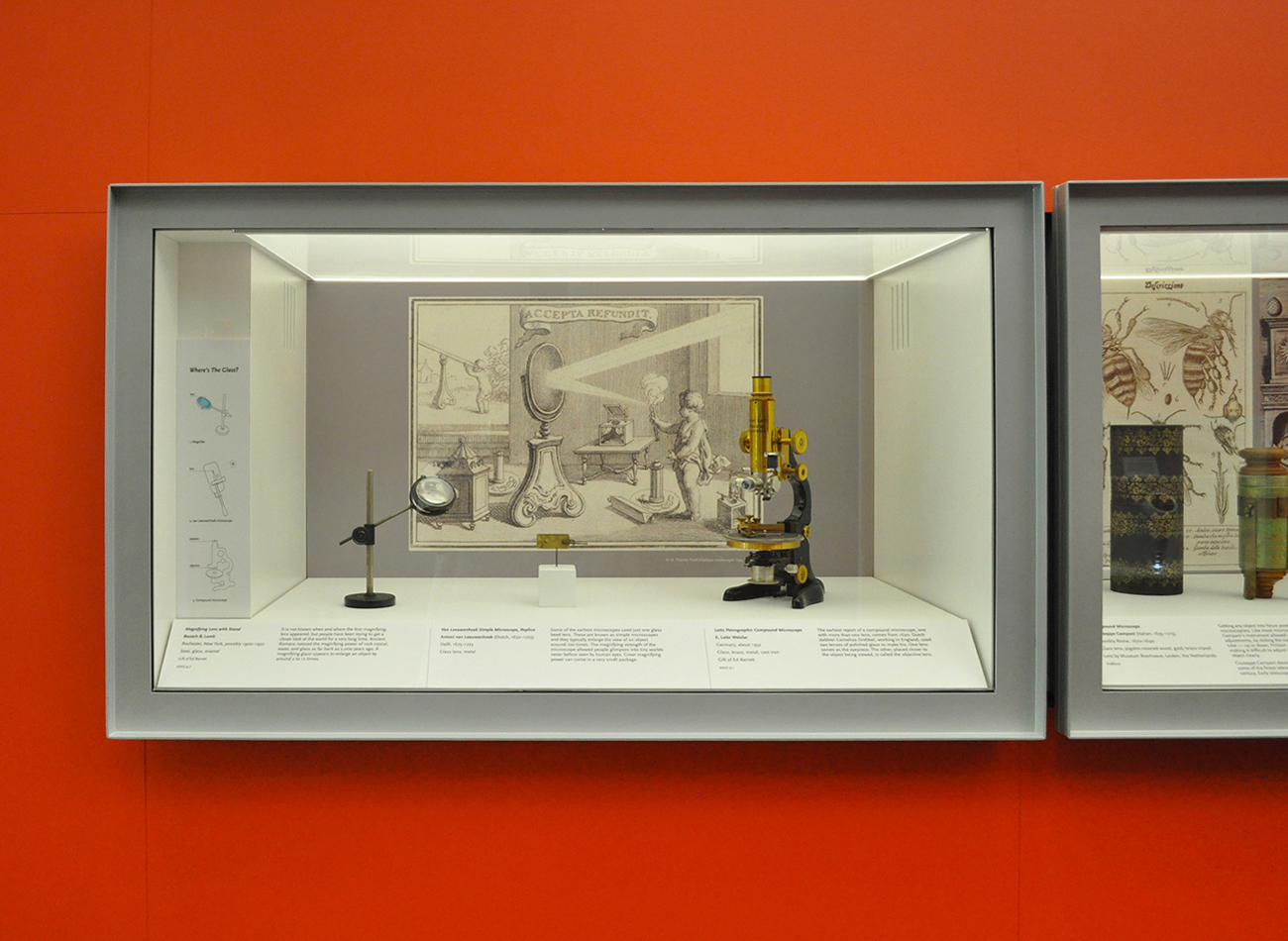 We designed a circular graphic pattern, inspired by the microscope lens, to cover the title wall. Each circle contains a close-up detail of drawings depicting objects that were discovered through the microscope.