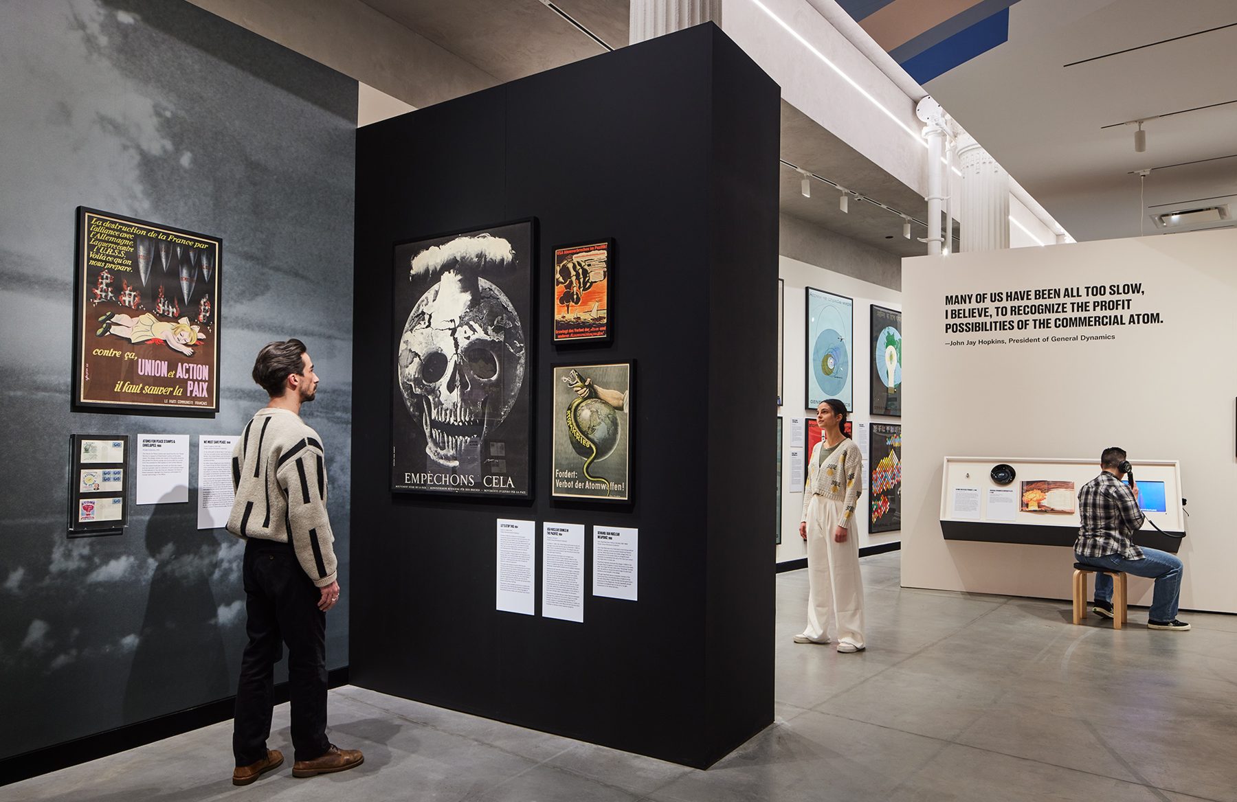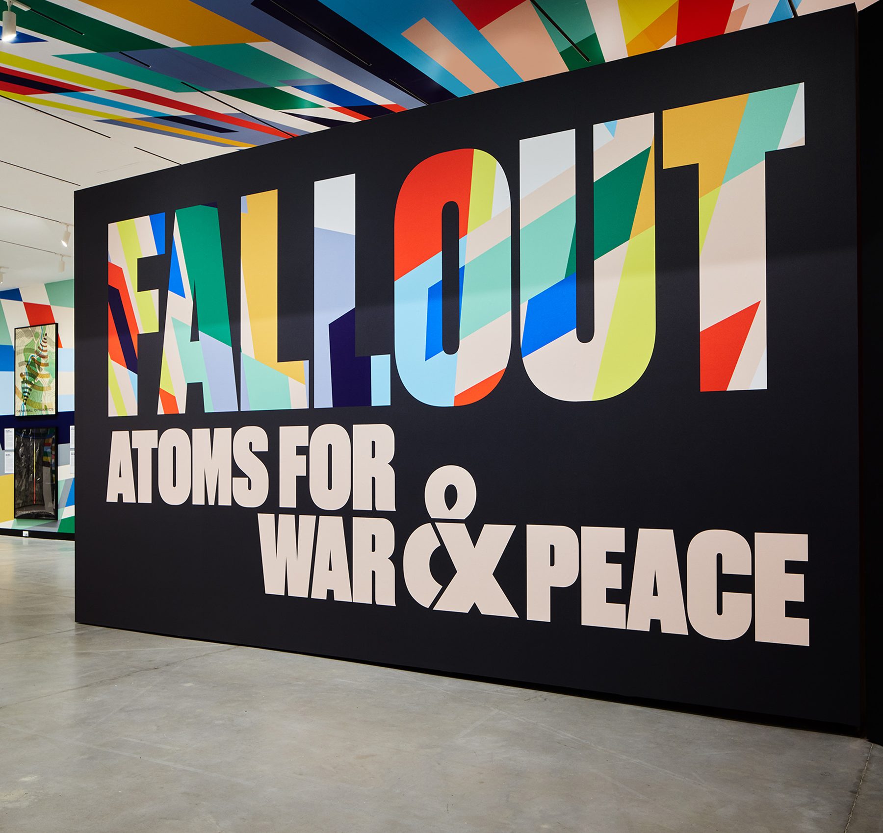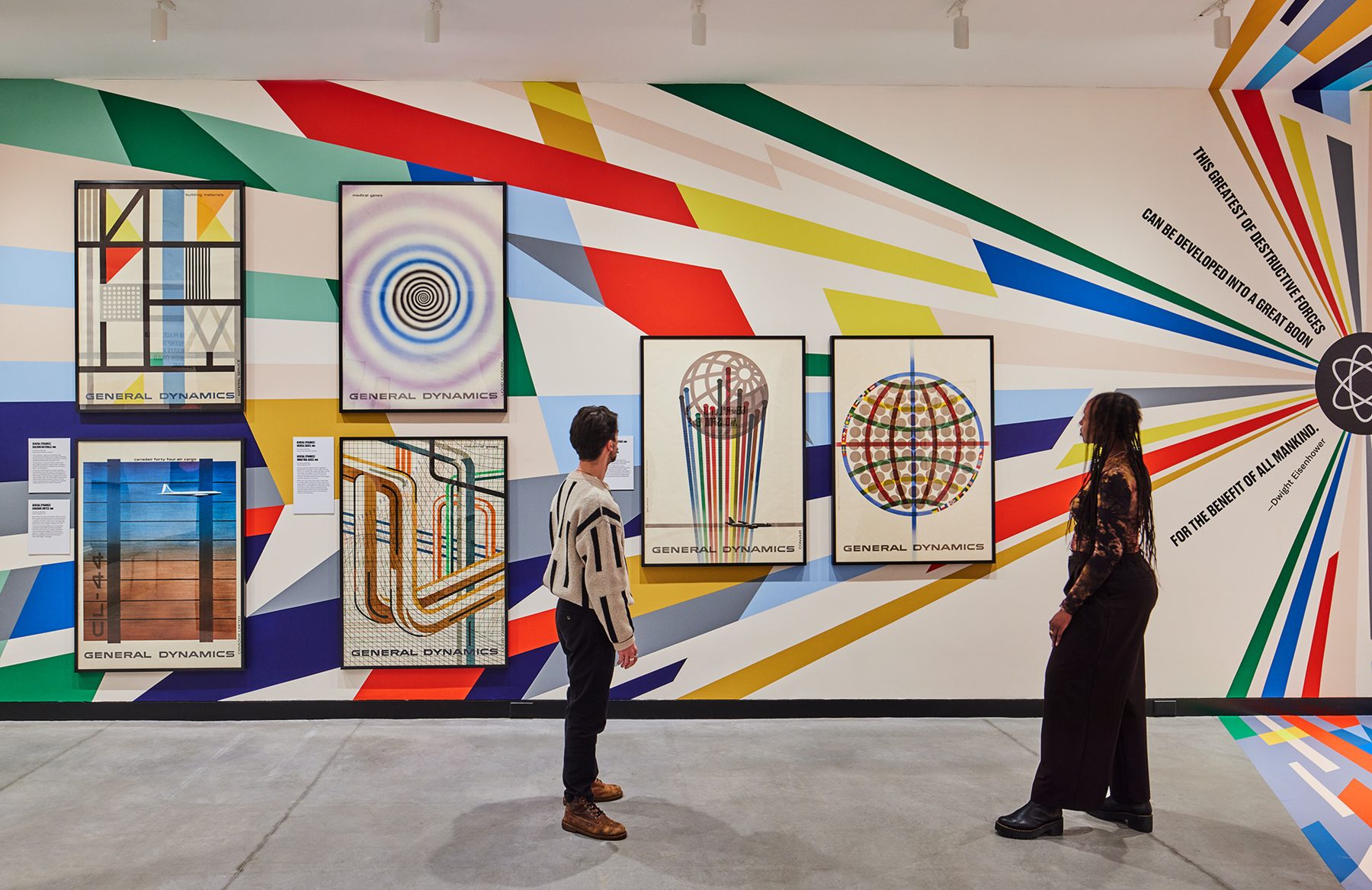 Our exhibition design extrapolated Erik Nitsche’s design for Atom for Peace poster that juxtaposed a quote from Eisenhower against Einstein’s, in the form of a colorful explosion, a schism resulting from the splitting of the atom, releasing color graphics that span distances, time, and surfaces.