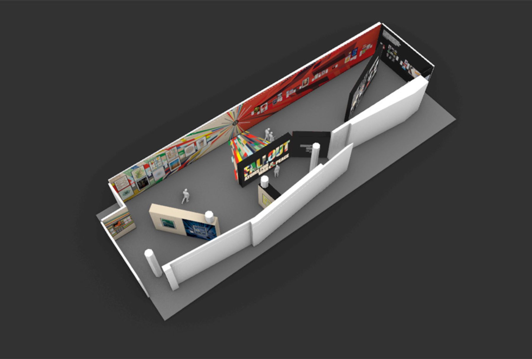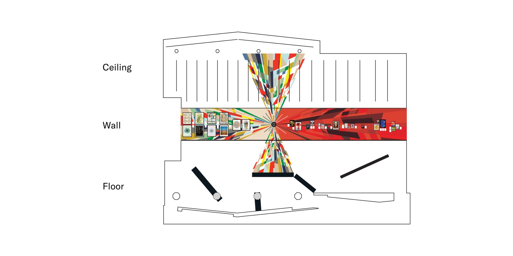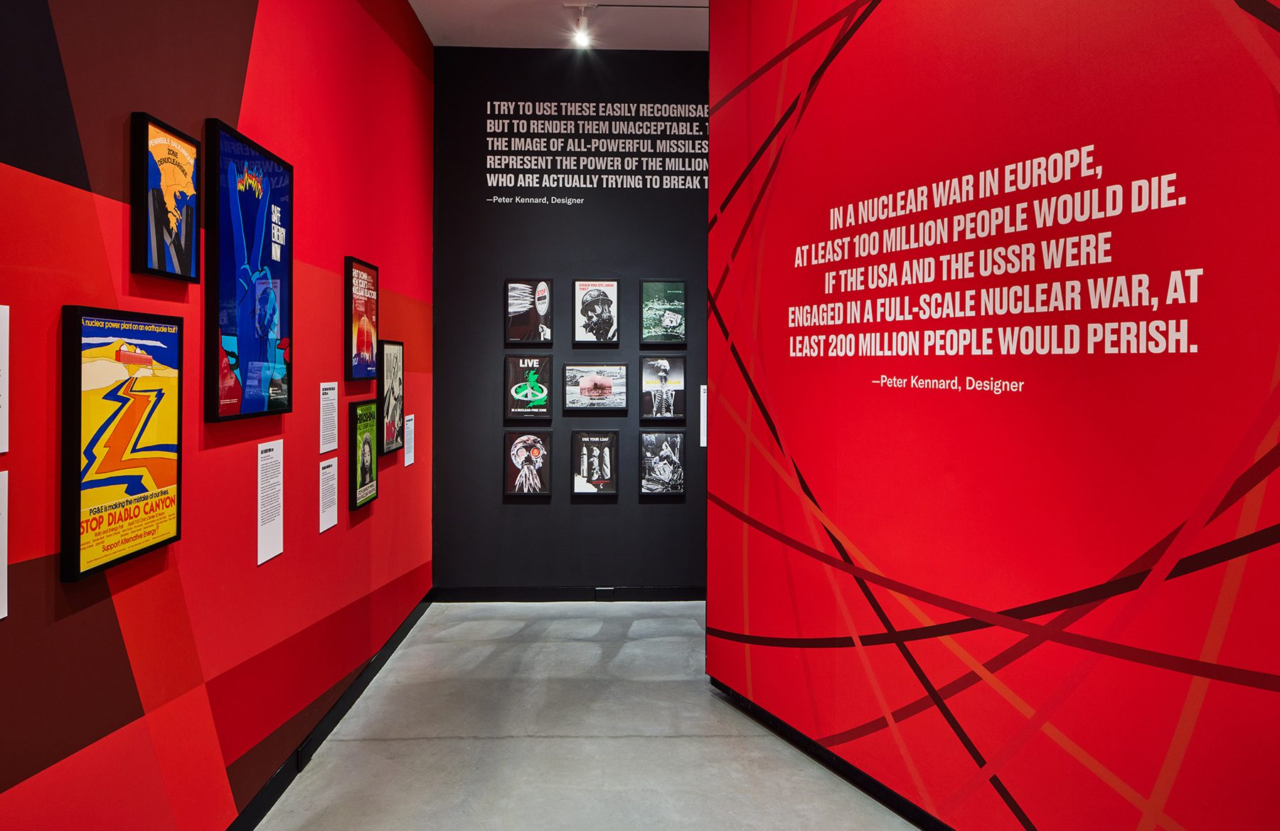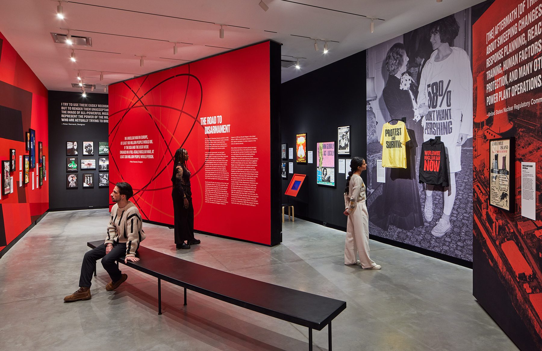 Our exhibition design extrapolated Erik Nitsche’s design for Atom for Peace poster that juxtaposed a quote from Eisenhower against Einstein’s, in the form of a colorful explosion, a schism resulting from the splitting of the atom, releasing color graphics that span distances, time, and surfaces.