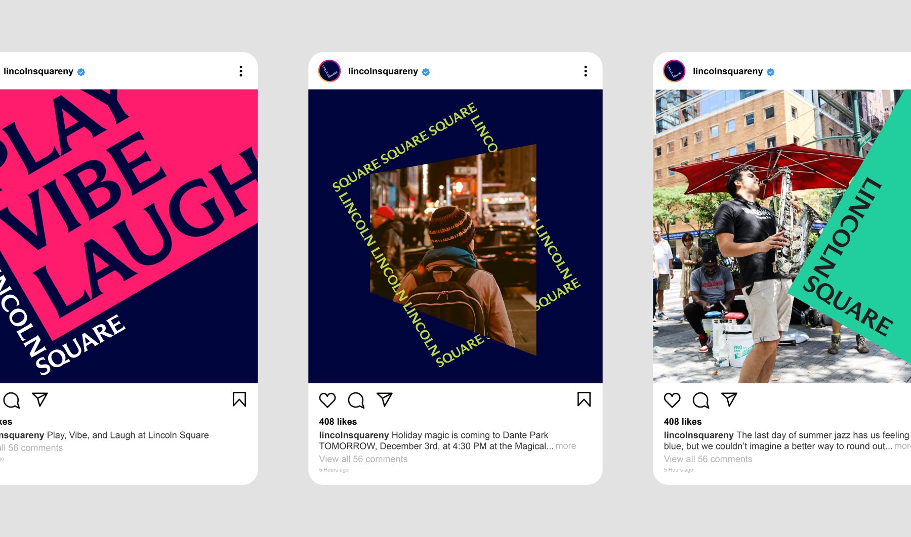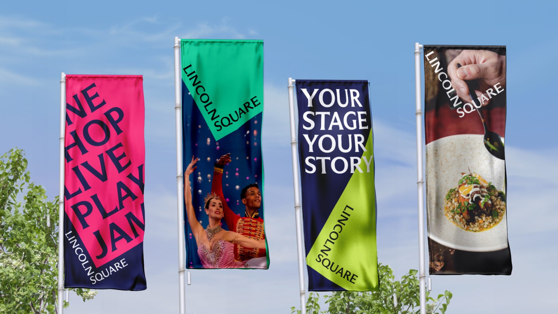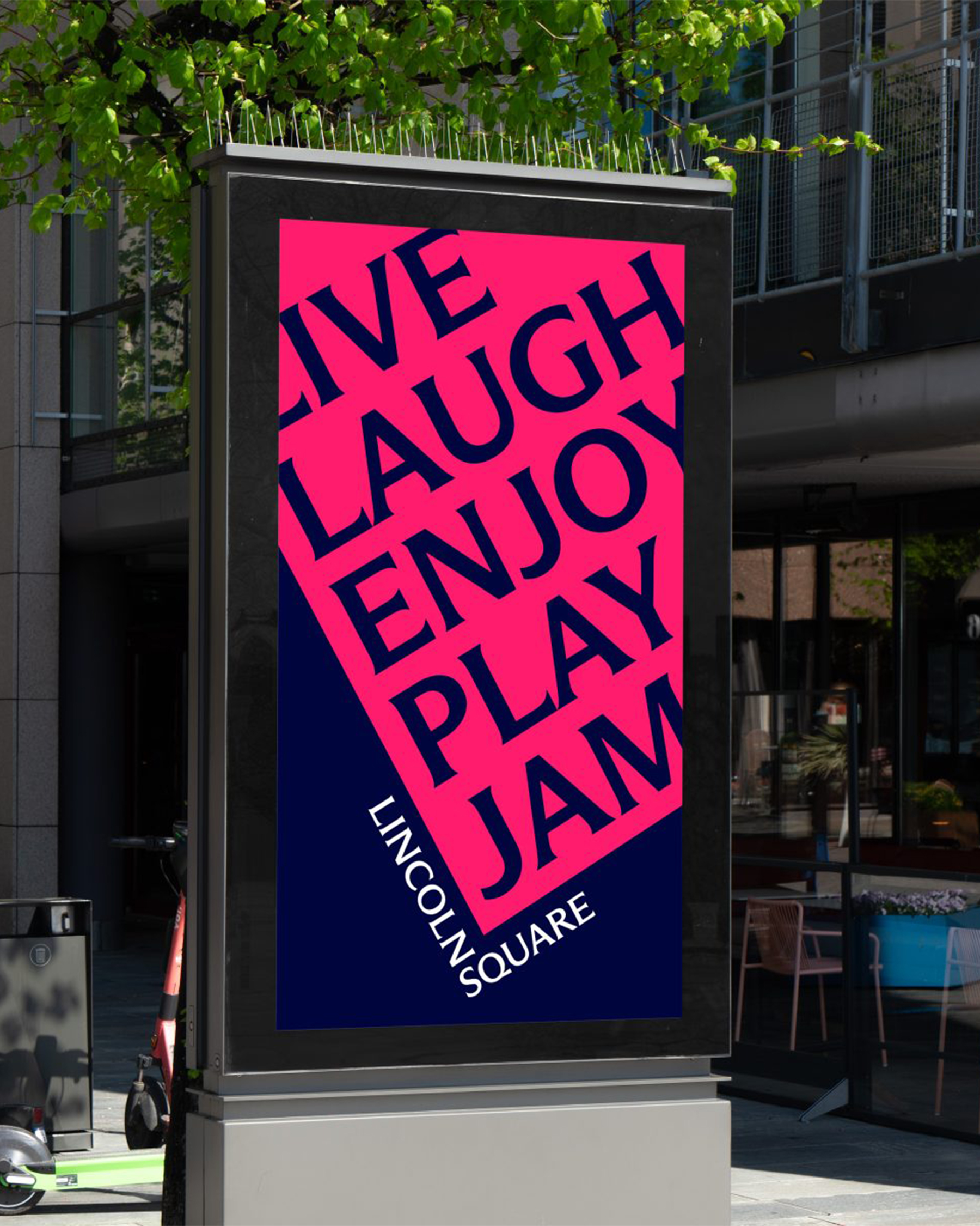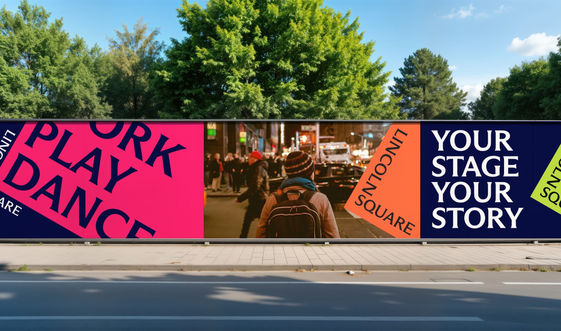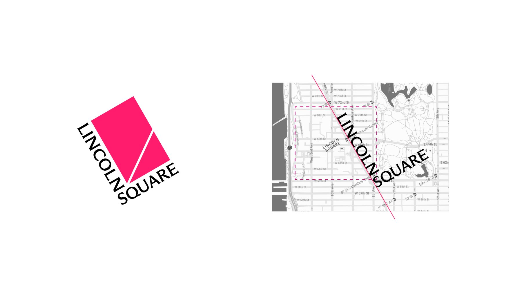 For this project, we introduced a bold new design system. The words LINCOLN and SQUARE interlock to form an “L,” wrapped around a rubin red block tilted at a 30º angle—a visual nod to the way Broadway cuts diagonally through the heart of Manhattan’s Upper West Side.