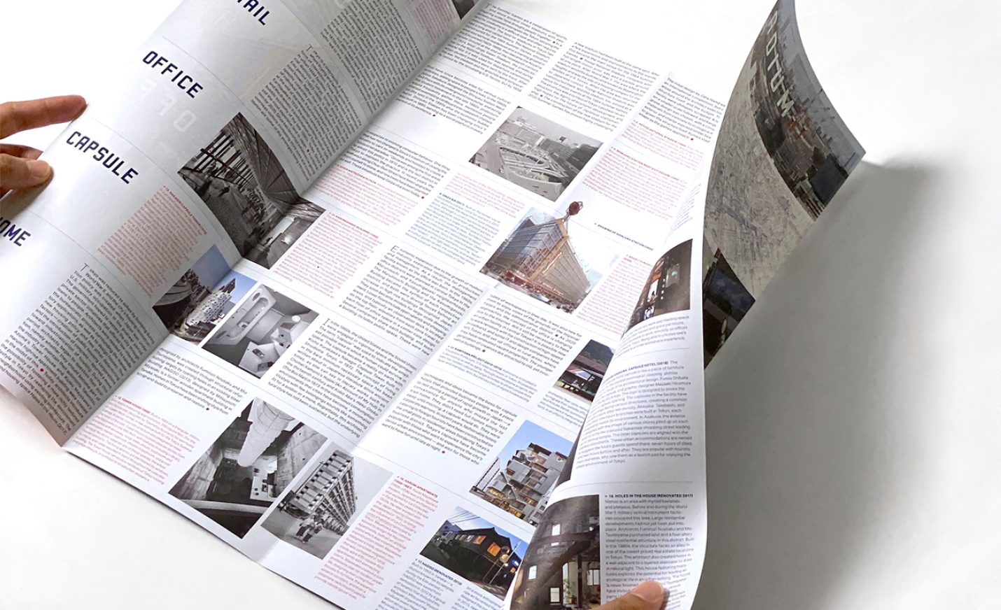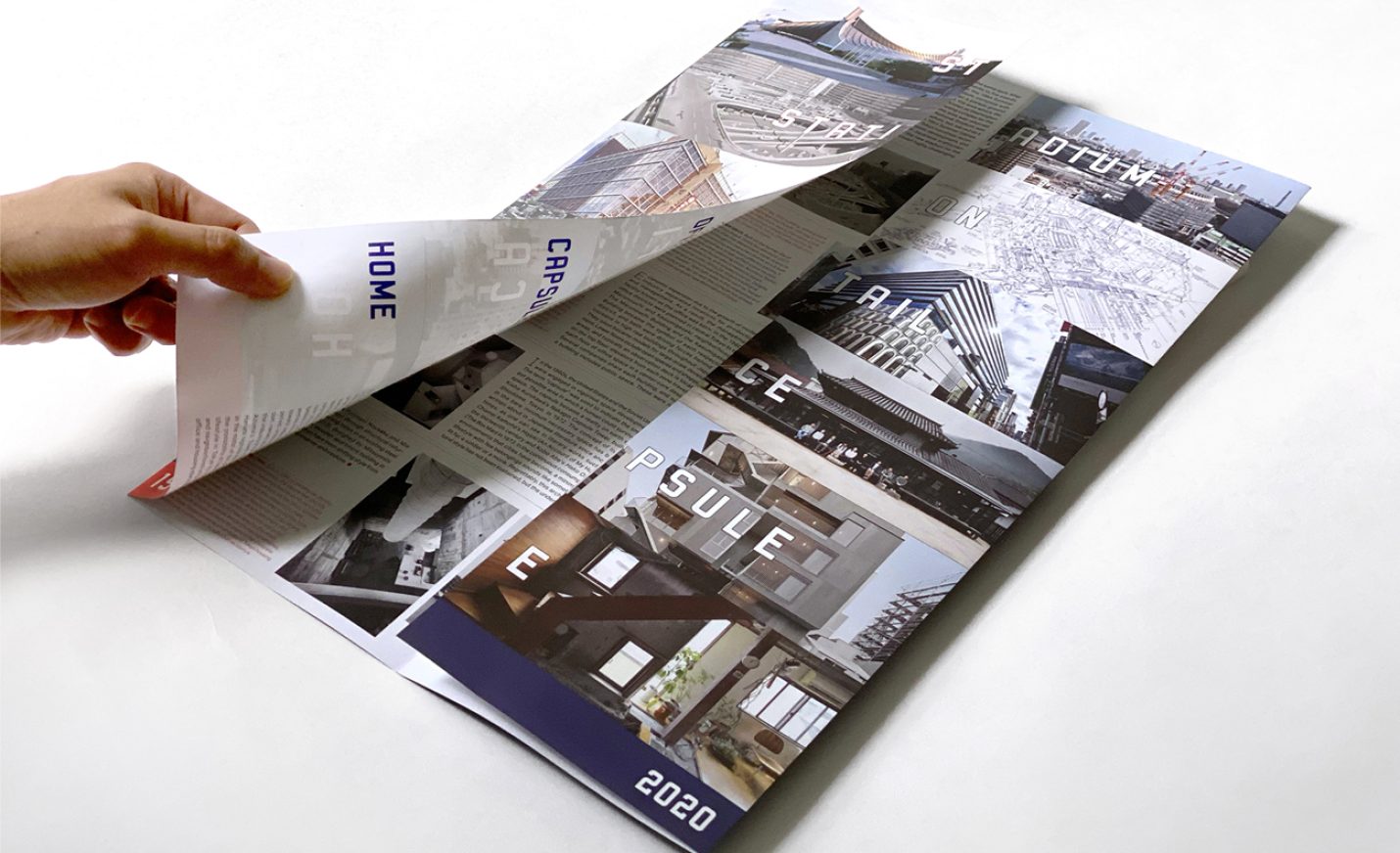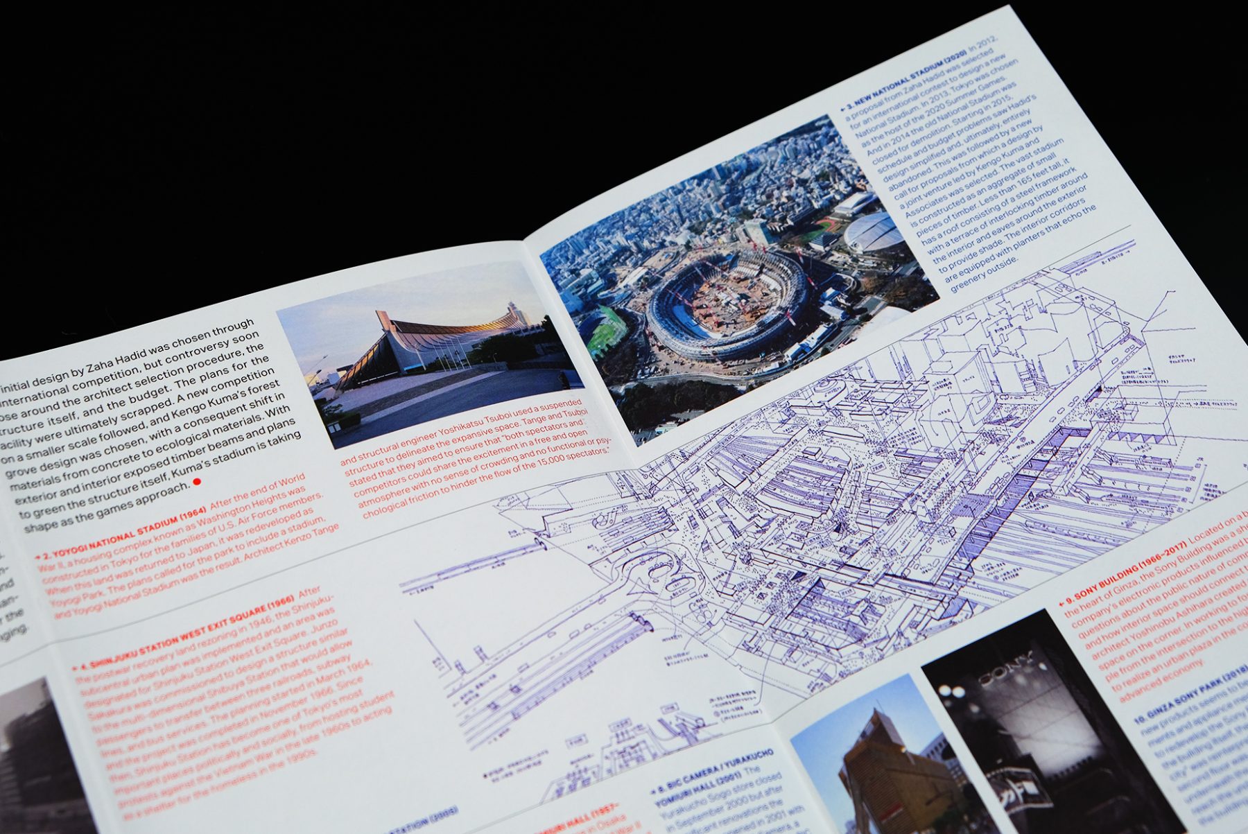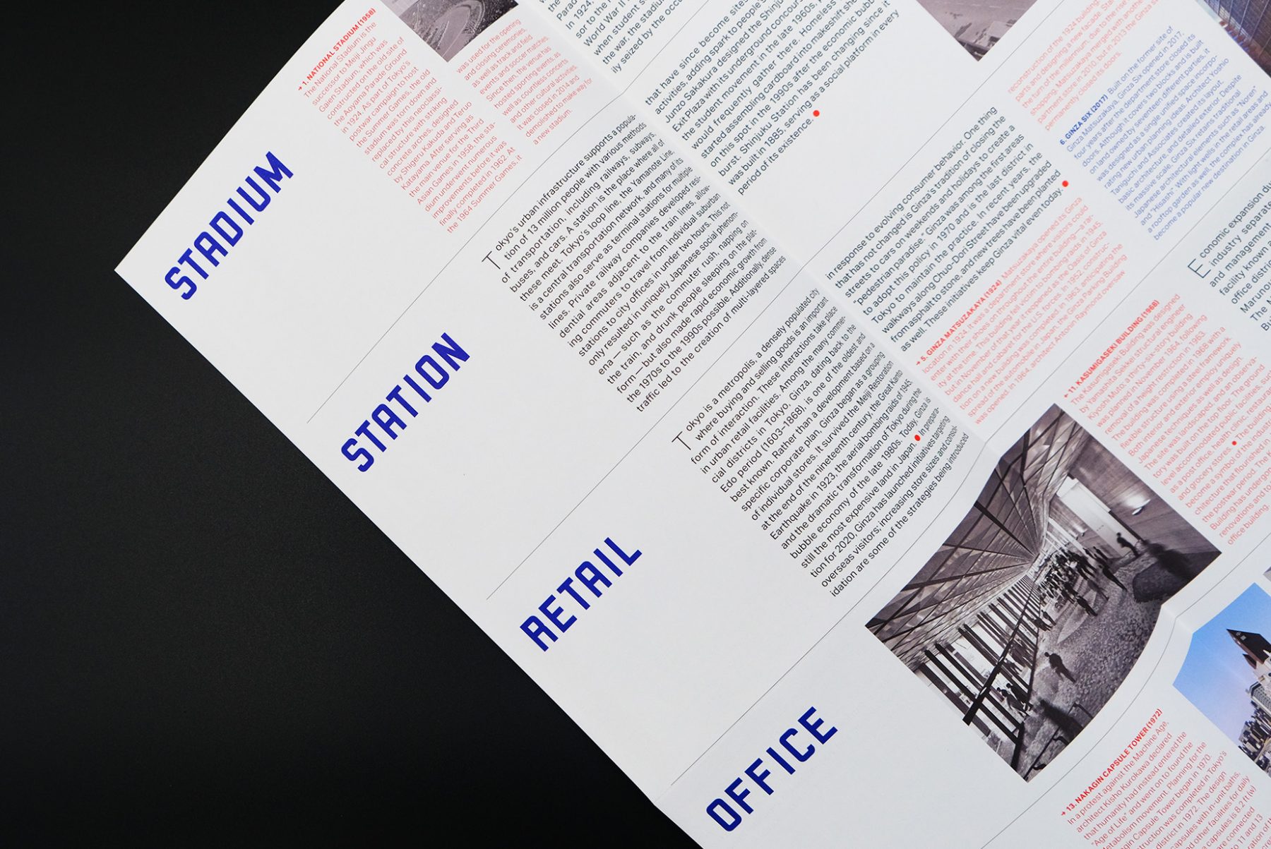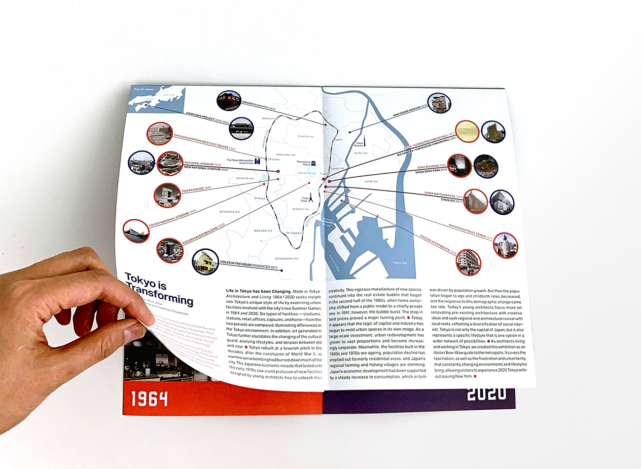We designed an exhibit brochure that unfolds as a map of Tokyo. The brochure features buildings covered in the exhibition, organized into six functional themes.