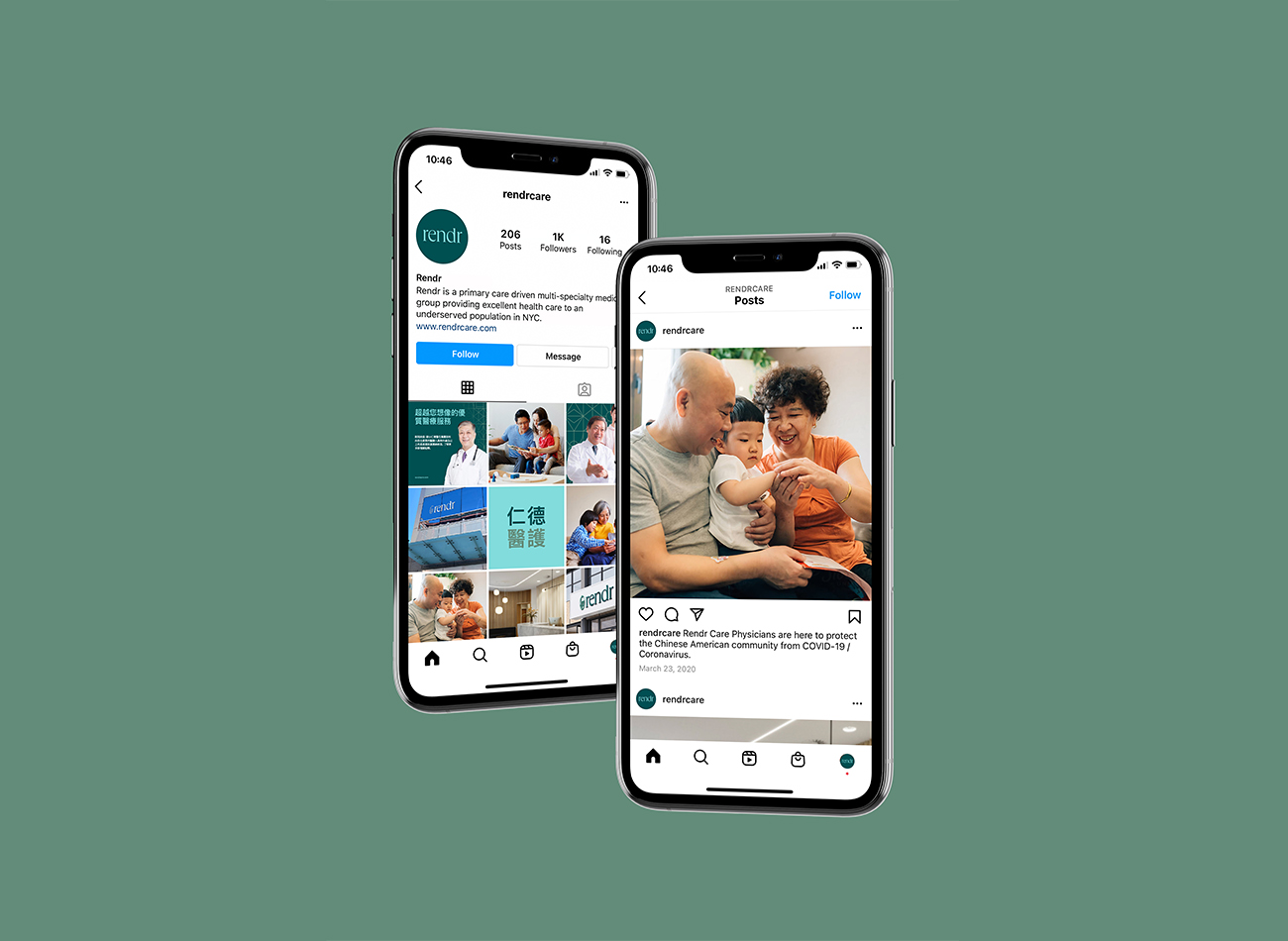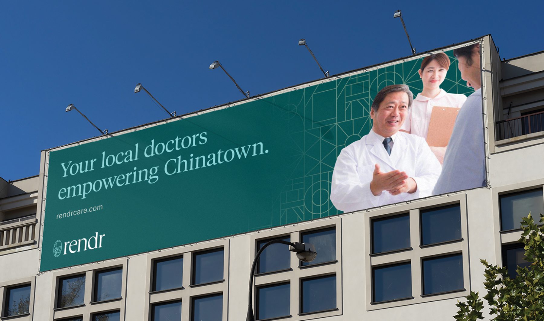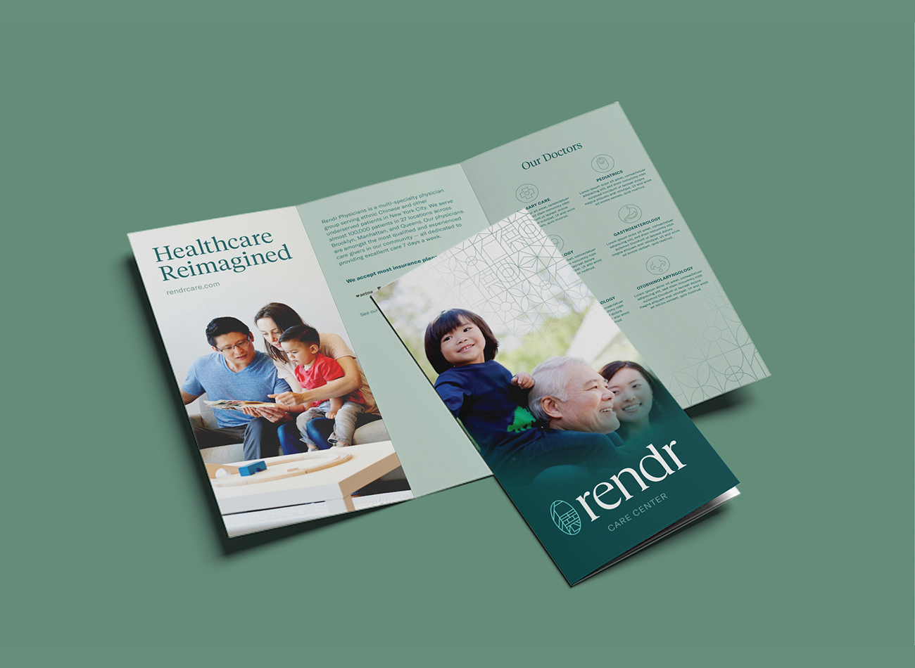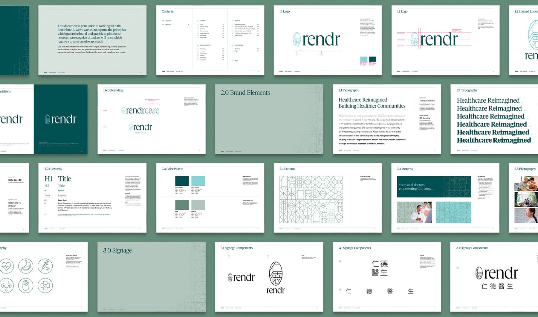 Tailored to engage the Chinese American demographic, the logomark seamlessly integrates Chinese characters into a gem-like emblem, ensuring inclusivity without sacrificing aesthetic appeal. The brand’s visual identity, characterized by a green palette and a blend of humanist English and sans-serif Chinese typefaces, reflects Rendr Care’s commitment to holistic health and cultural sensitivity, and creates a cohesive and inviting brand experience for all.