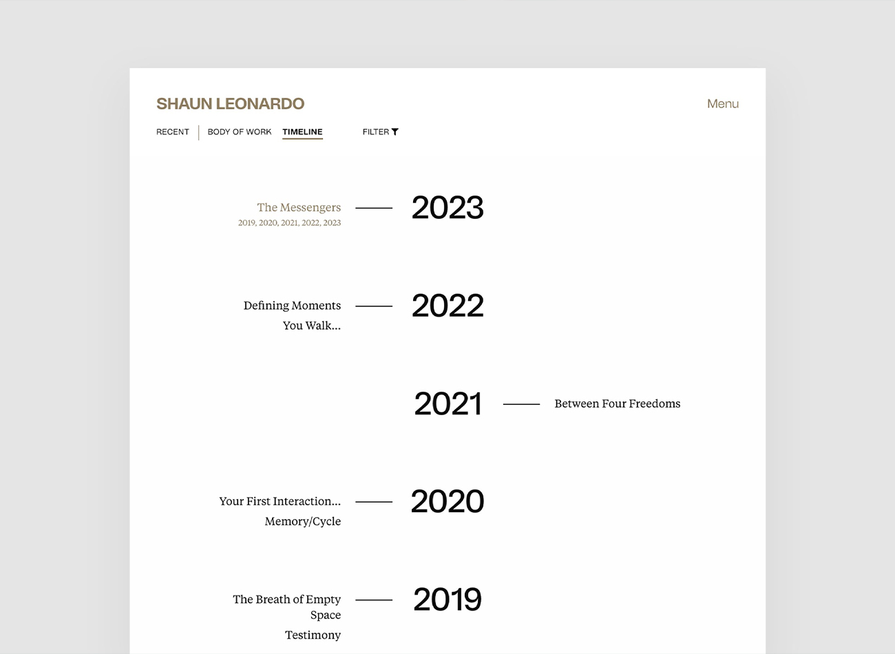 During the design process, our collaboration with Shaun focused on effectively showcasing the complex nature of his artworks. This resulted in a design solution that allowed users to navigate seamlessly through filtered timelines and body of works, ensuring both visual appeal and user-friendly functionality. In addition to its filtering feature, the website serves as a comprehensive source for Shaun’s extensive archive of lectures, keynotes, writings, press releases, and interviews, all thoughtfully organized in a visually polished layout.