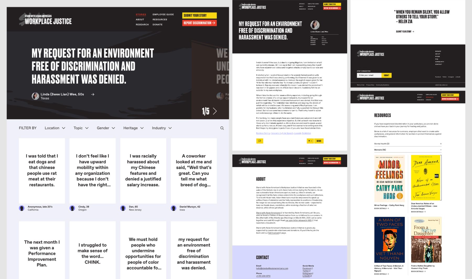 We achieved an iconic visual identity through experimentation with brushed lettering combined with a modern, dynamic, and progressive look. The resulting identity communicates a sense of urgency while avoiding alienation by maintaining an approachable, inclusive, and universal appeal. This branding was featured in Asian American Justice Rally posters and signage, the organization’s website, and a separate workplace-justice website that gave users the opportunity to share personal stories of workplace discrimination. In our website design, we also utilized animation to express unity among diverse ethnicities.