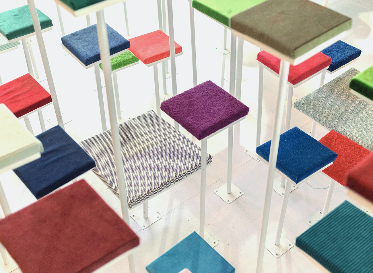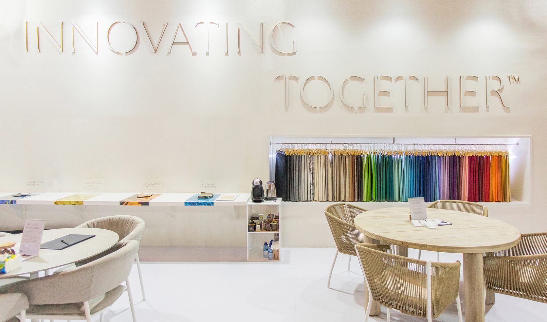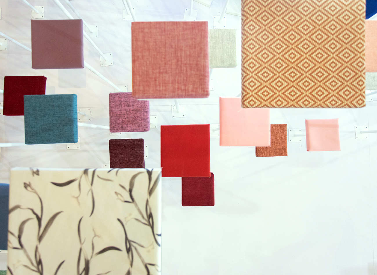 KUDOS’s unconventional exhibition design served as a captivating draw for both existing patrons and prospective clients, sparking widespread interest among Expo visitors. A highlight of the exhibition was its incorporation of indoor and outdoor furniture pieces, all upholstered in unique, high-quality textiles. We created a simple design system of square fabric tiles that invited guests to explore and be inspired by the infinite possibilities of functionality and aesthetics.